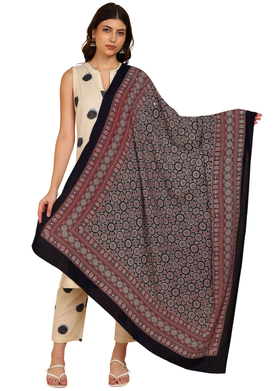 The Intricate block prints from Kutch with their Sindhi roots comes in definite geometric and floral patterns in natural shades. Ajrakh is very distinct from the other styles of block printing and can be identified with the intricacy of prints and the natural tone.